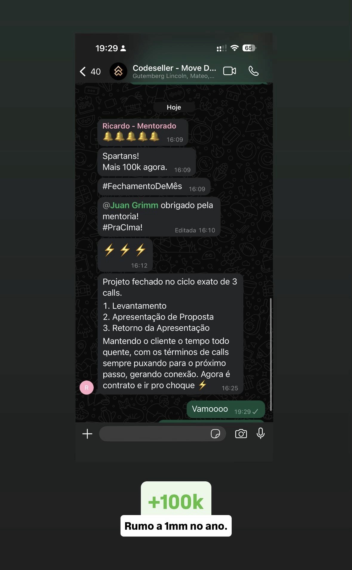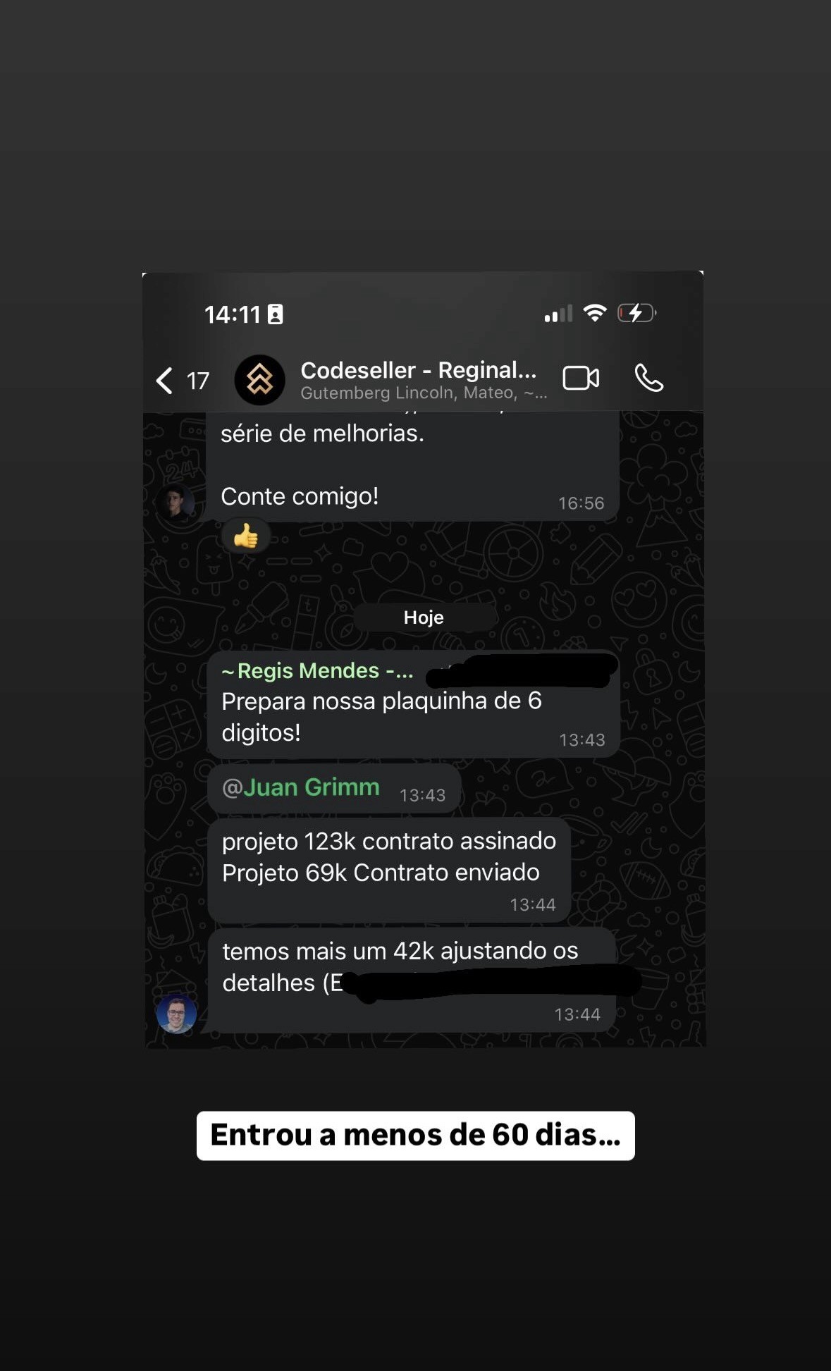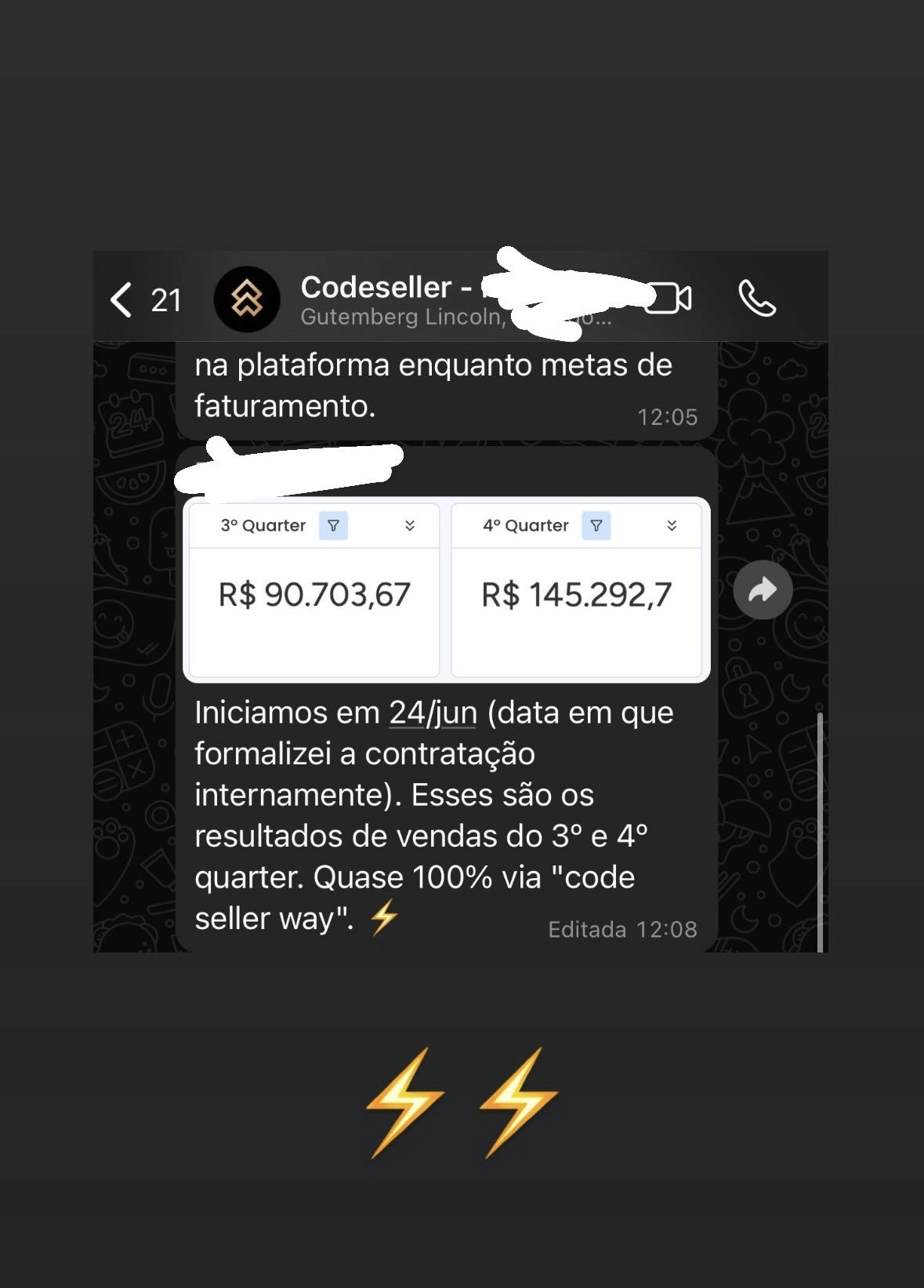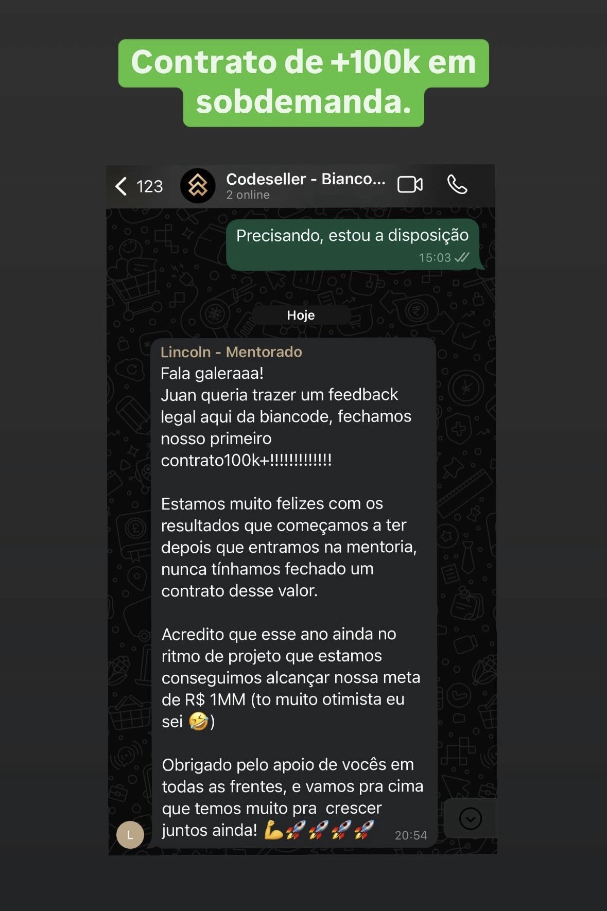A mentoria me ajudou a não deixar mais o dinheiro na mesa, e apenas seguindo o método CodeSeller eu obtive resultados em poucos meses que eu levo um ano de trabalho CLT pra fazer. Isso mudou minha vida, me deu a confiança de saber que eu posso mais, quebrou diversas crenças que me limitavam. Nada como um bom resultado para gerar motivação para continuar e persistir.