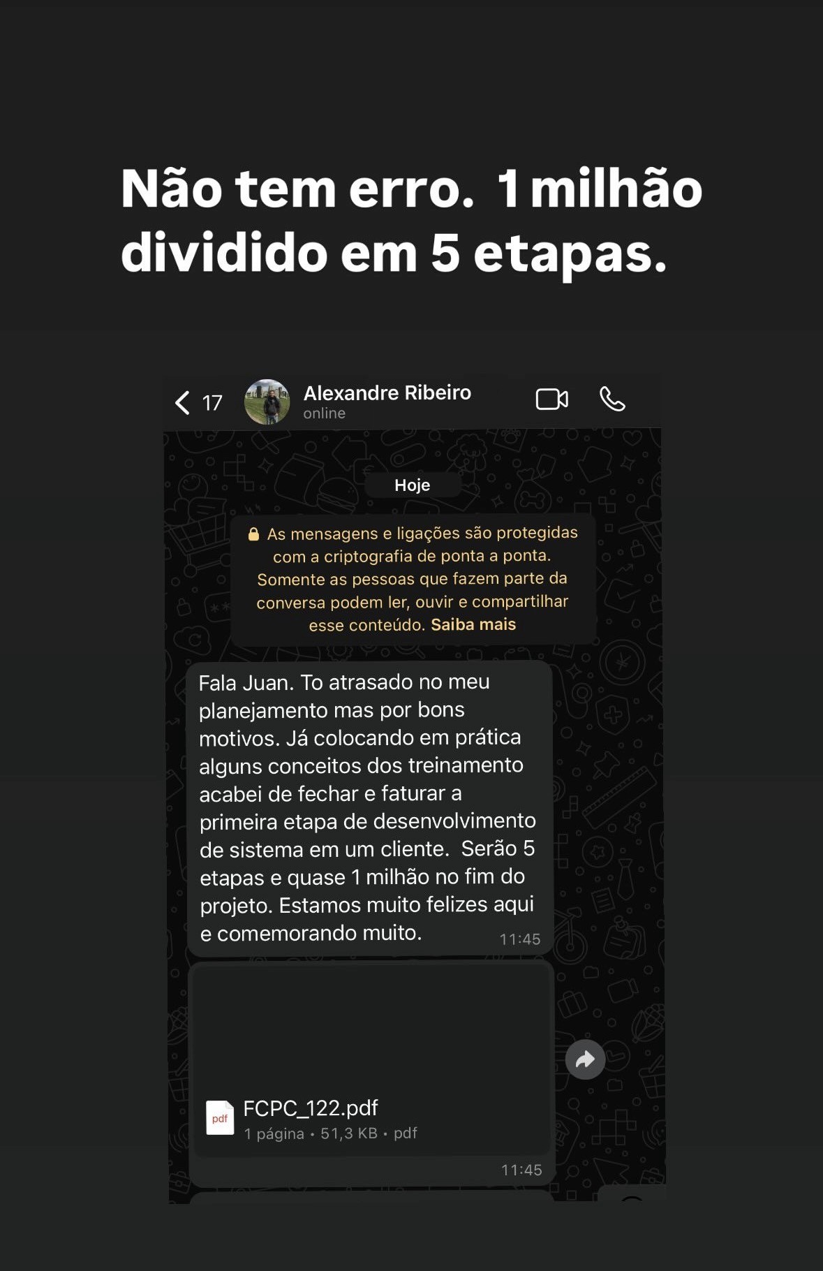 "em quatro meses o faturamento da minha software house dobrou. eu não tenho nem palavras para o quanto sou grato ao Juan e equipe"