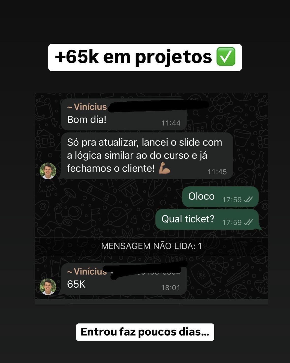 "Eu entrei na mentoria sem saber se ia conseguir pagar, faturando +- 10k/mês com muito esforço. Em poucos meses de mentoria, aplicando e estudando as técnicas desenvolvidas pelo Juan, fui capaz de duplicar o meu faturamento, alcançando 20k/mês com muito maior previsibilidade e fechando 90% das reuniões de venda (esse material do curso vale OURO). Os consultores sempre se mostram disponíveis e o Juan já até conseguiu diversos jobs para mim! Resumindo, além de aumentar o meu faturamento, estou continuamente aprendendo muito sobre negócios, vendas e como escalar minha empresa! Só tenho a agradecer ao Juan e a toda equipe por estar do meu lado durante essa jornada."